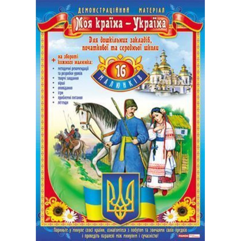 "Картки: Моя країна - Україна" 16 карток з розробками уроків на звороті. Містить певну кількість малюнків, на звороті яких пропонуються теми бесід, загадки, лічилки, вірші, прикмети, ігрові вправи та творчі завдання.